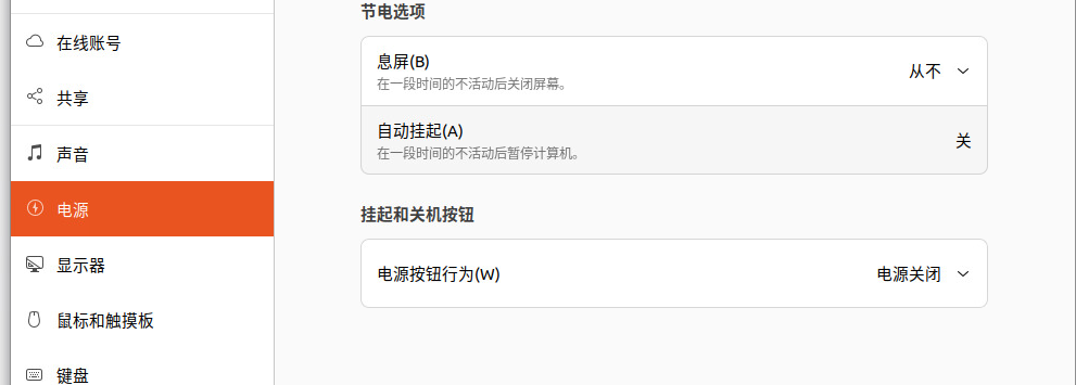 五. 问题机器进入休眠模式会推出VNC 终端界面,修改配置setting ----->电源----->息屏--从不