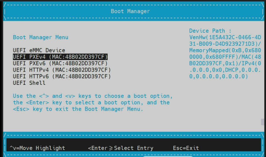 上电开启jetson AGX Orin 机器,进入开机显示logo 界面按esc按键进入UEFI bootloader 启动选择界面,选择PXEv4(备注下面图片来自网络)