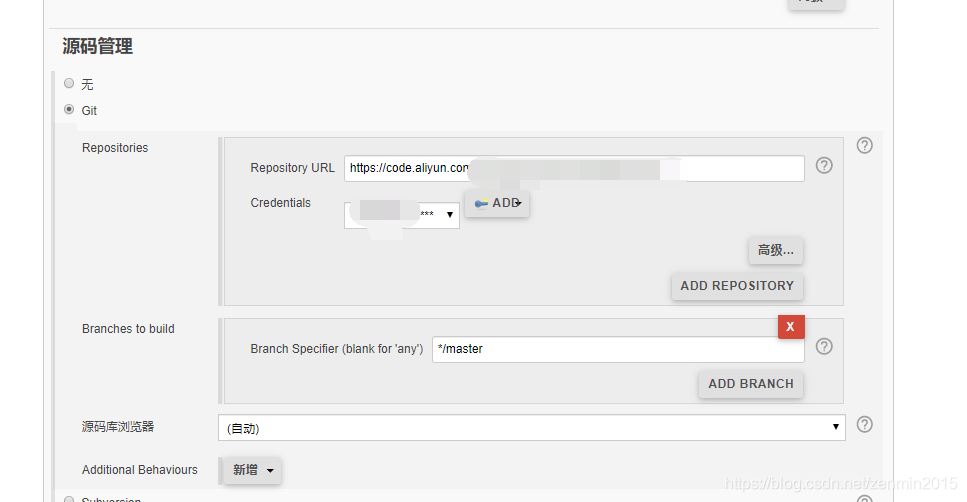 此处我以阿里云gitlib为例 当然也可以自己搭gitlib 一样的道理,设置好仓库url 和 Credentials 这个是连接gitlib仓库的账号密码