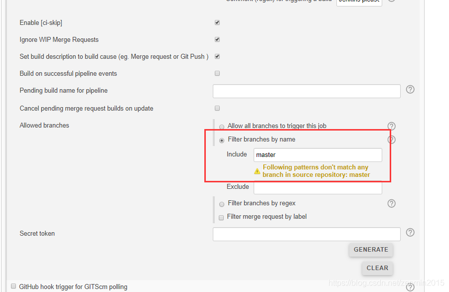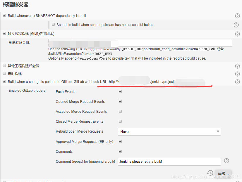 接下来有的同学会问 我git上有多个分支 Jenkins下每个分支一个项目 那我向git仓库推送 然后触发Jenkins webhook的时候 Jenkins怎么知道我是哪一个分支呢,其实Jenkins也想到了这一点 提供了分支识别 我们进入 Jenkins - 项目 - 配置 - 构建触发器 - 高级展开