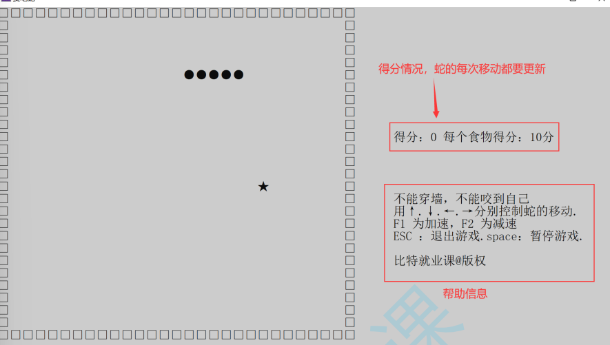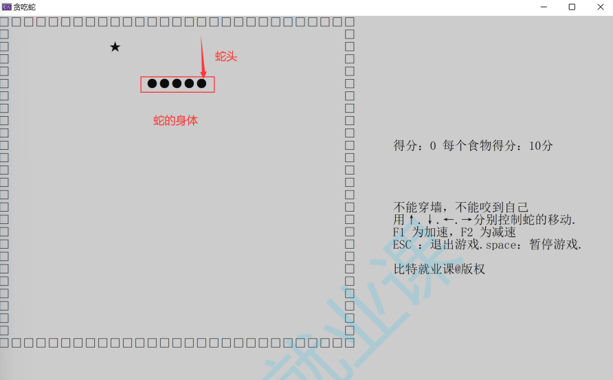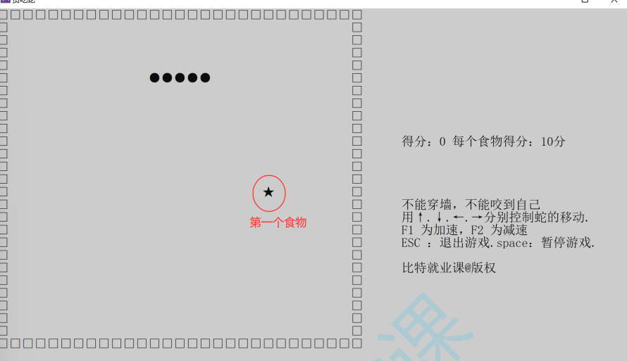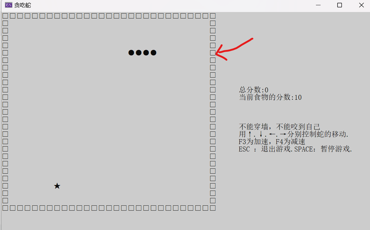 关于⻝物,就是在墙体内随机⽣成⼀个坐标(x坐标必须是2的倍数),坐标不能和蛇的⾝体重合,然后打印★。