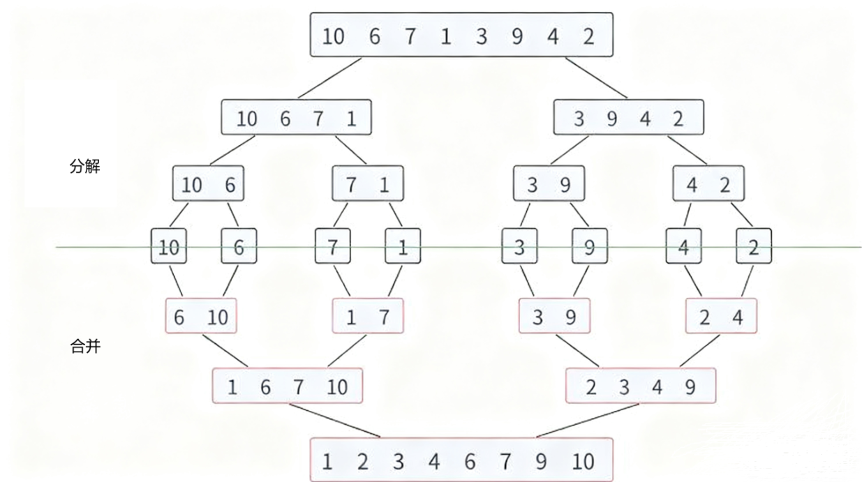 基本思想:归并排序(MERGE-SORT)是建⽴在归并操作上的⼀种有效的排序算法,该算法是采⽤分治法(Divide and Conquer)的⼀个⾮常典型的应⽤。将已有序的⼦序列合并,得到完全有序的序列;即先使每个⼦序列有序,再使子序列段间有序。若将两个有序表合并成⼀个有序表,称为二路归并。
