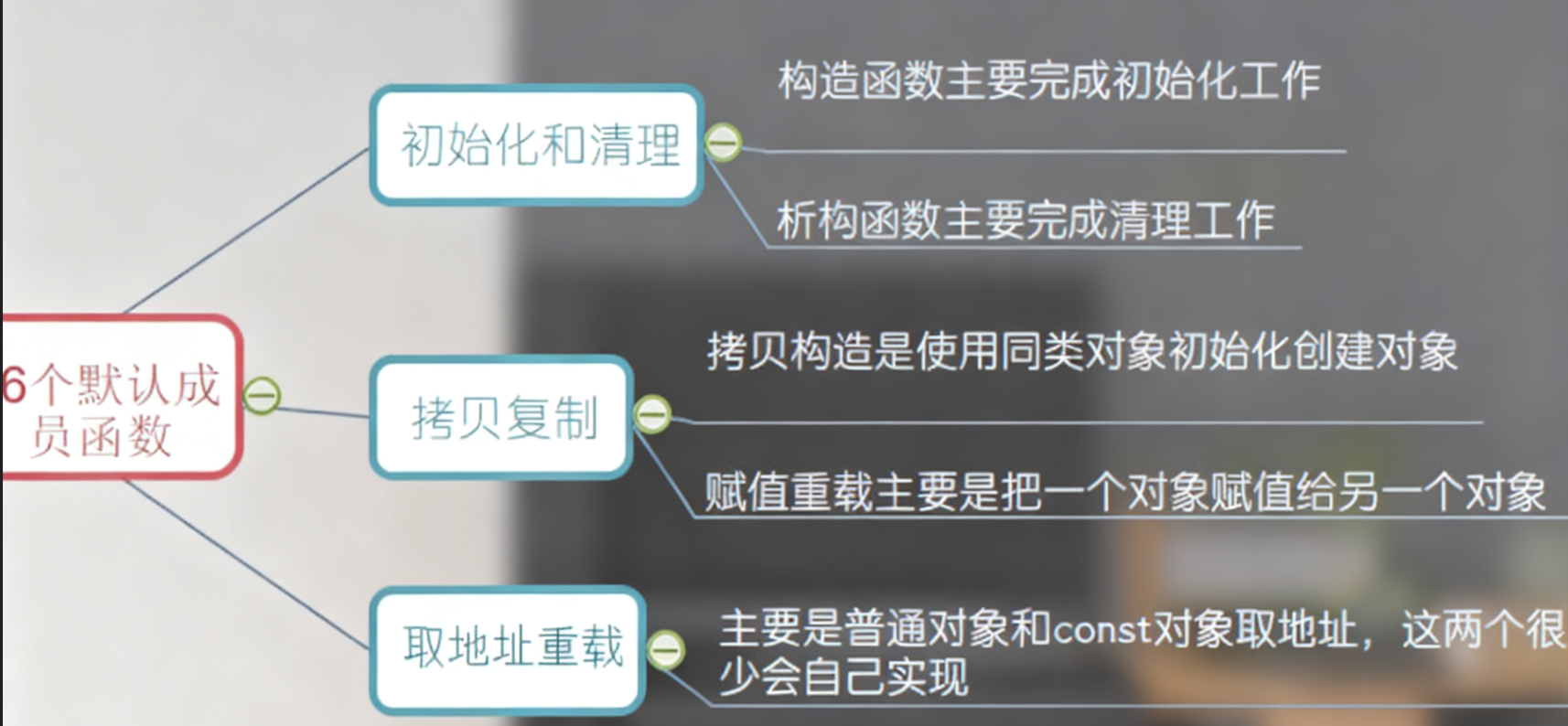 默认成员函数就是用户没有显式实现,编译器会⾃动⽣成的成员函数称为默认成员函数。⼀个类,我们不写的情况下编译器会默认⽣成以下6个默认成员函数,需要注意的是这6个中最重要的是前4个,其次就是C++11以后还会增加两个默认成员函数,移动构造和移动赋值,这里暂时不展开讲。