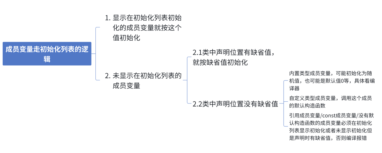 • 尽量使⽤初始化列表初始化,因为那些你不在初始化列表初始化的成员也会⾛初始化列表,如果这个成员在声明位置给了缺省值,初始化列表会⽤这个缺省值初始化。如果你没有给缺省值,对于没有显⽰在初始化列表初始化的内置类型成员是否初始化取决于编译器,C++并没有规定。对于没有显⽰在初始化列表初始化的⾃定义类型成员会调⽤这个成员类型的默认构造函数,如果没有默认构造会编译错误。