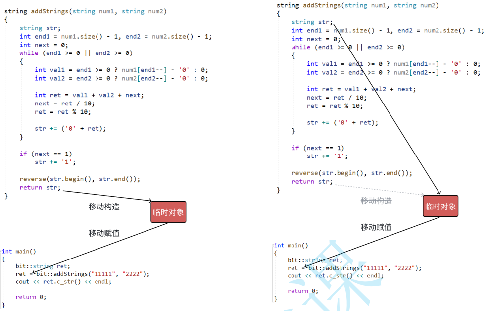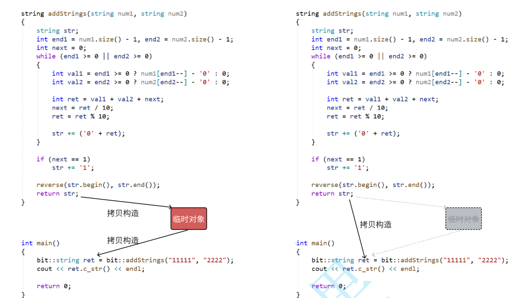 需要注意的是在vs2019的release和vs2022的debug和release,上⾯代码会进⼀步优化,直接构造要返回的临时对象,str本质是临时对象的引⽤,底层⻆度⽤指针实现。运⾏结果的⻆度,我们可以看到str的析构是在赋值以后,说明str就是临时对象的别名。