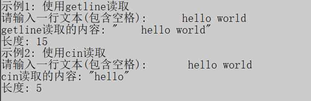 std::getline(std::cin, input2); // 用户输入: Hello World