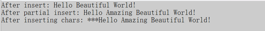 std::cout << "After insert: " << str << std::endl; // "Hello Beautiful World!"