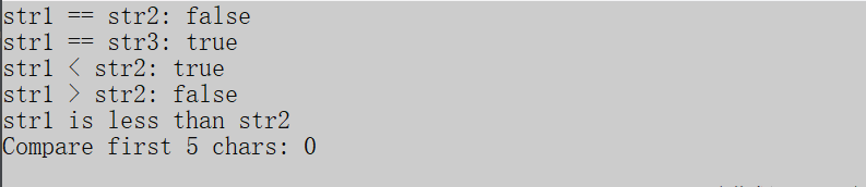 std::cout << "Compare first 5 chars: " << result << std::endl; // 0 (相等)
