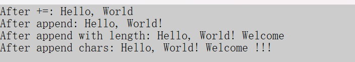 std::cout << "After append chars: " << str << std::endl; // "Hello, World! Welcome!!!"