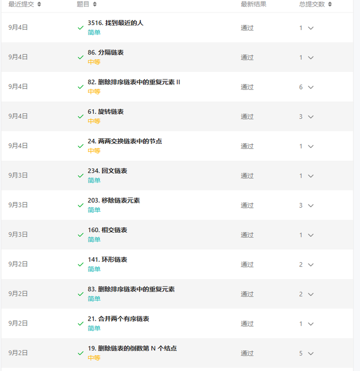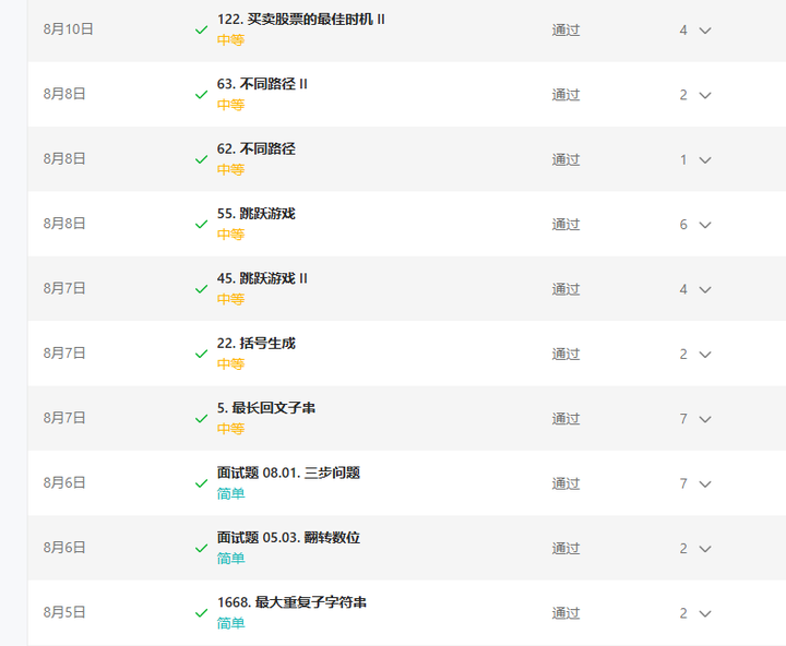 最开始连双指针是什么都搞不懂,链表题看一眼就头疼,动态规划更像是某种“黑魔法”。但现在,一个月过去了,我可以独立完成大部分简单和中等难度的题目,尤其是经典题型:双指针、哈希表、链表、动态规划,都能慢慢摸出套路。