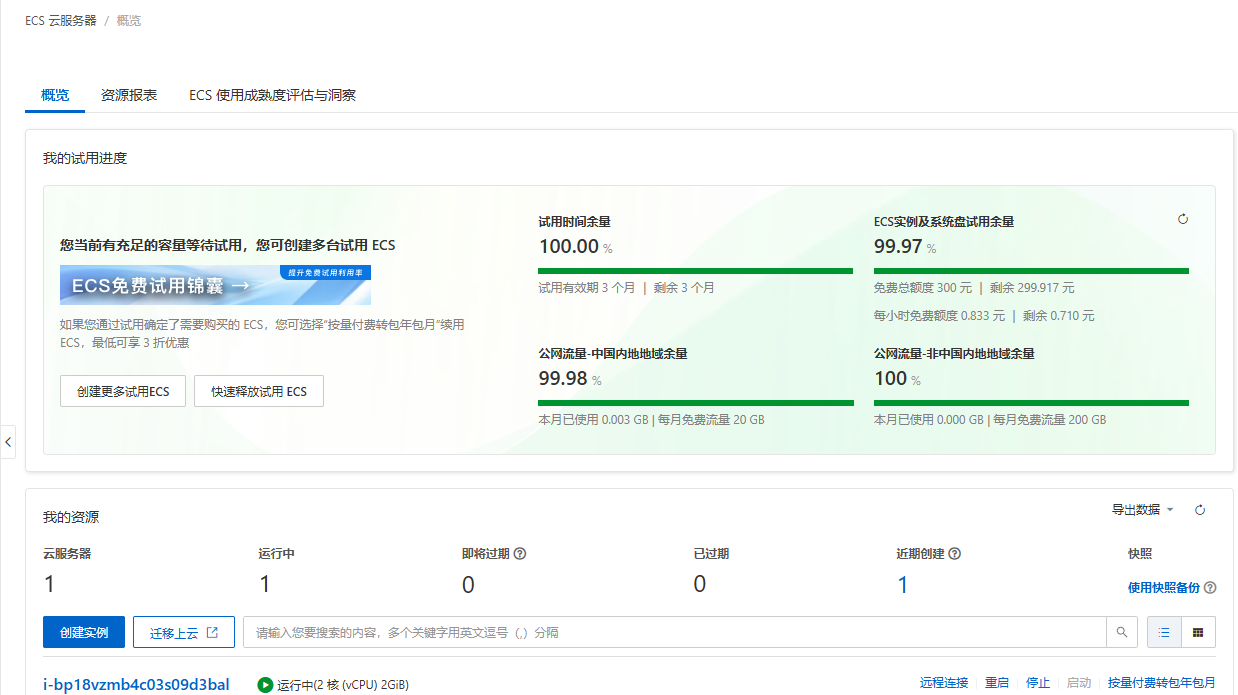 1、首先是数据库服务器准备,我选择用阿里云提供的免费试用ECS实例,规格是2核2GB的,可以试用三个月,已经满足个人开发学习需求了。领取也很简单,注册账号登录,选择ECS实例,点击免费试用就可以了,我选择的操作系统是Ubuntu 22.04 64位 。