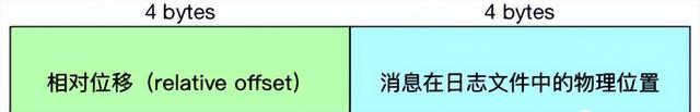 上图是OffsetIndex的结构,位移值用 4 个字节来表示,物理磁盘位置也用 4 个字节来表示。可能会疑问,位移值offset不是长整型吗,应该是 8 个字节才对啊?这是因为offset=baseOffset+relativeOffse,使用相对位移值可以节省磁盘空间。