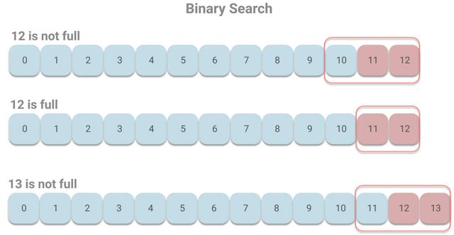 下面我们还是用之前的例子来看下。由于每个页最多包含512个索引项,而最后的1024个索引项所在页会被认为是热区。那么当12号页未满时,则10、11、12会被判定是热区;而当12号页刚好满了的时候,则11、12被判定为热区;当增至13号页且未满时,11、12、13被判定为热区。假设我们读取的是最新的消息,则在热区中进行二分查找的情况如下: