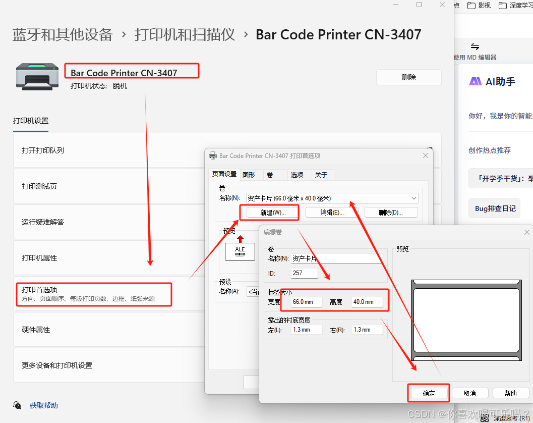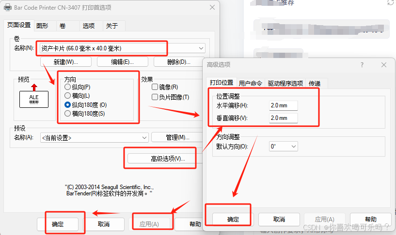 其次,通过试错打印 设置方向、水平偏移和垂直偏移,通过打印效果来调整参数大小