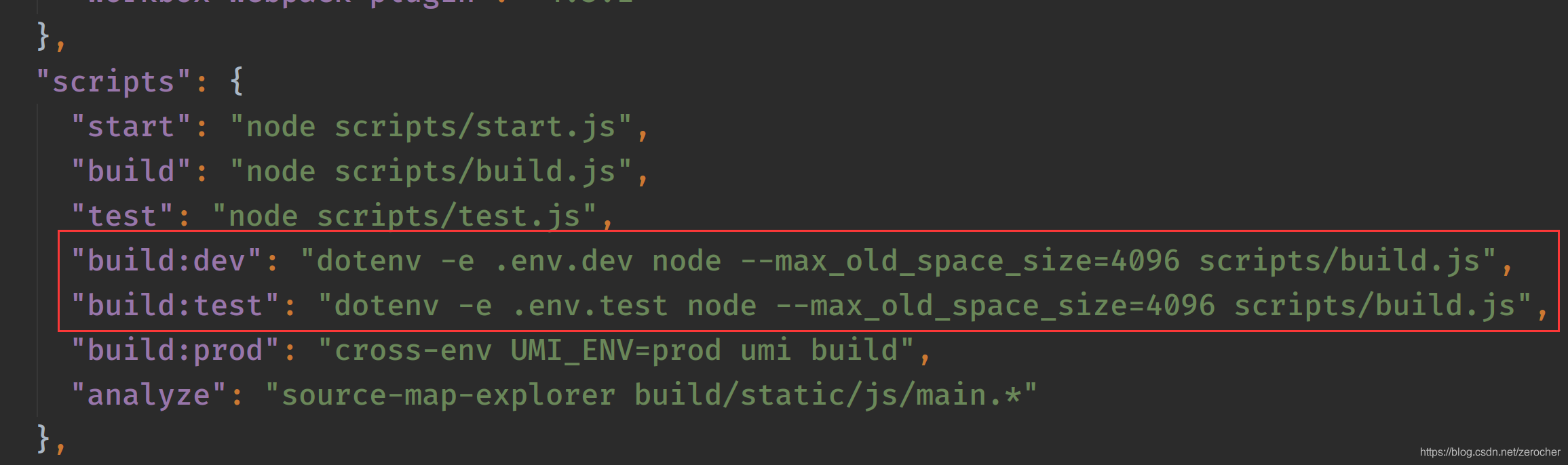 npm run build不同环境打包区分,:dev,:test,:prod区分。