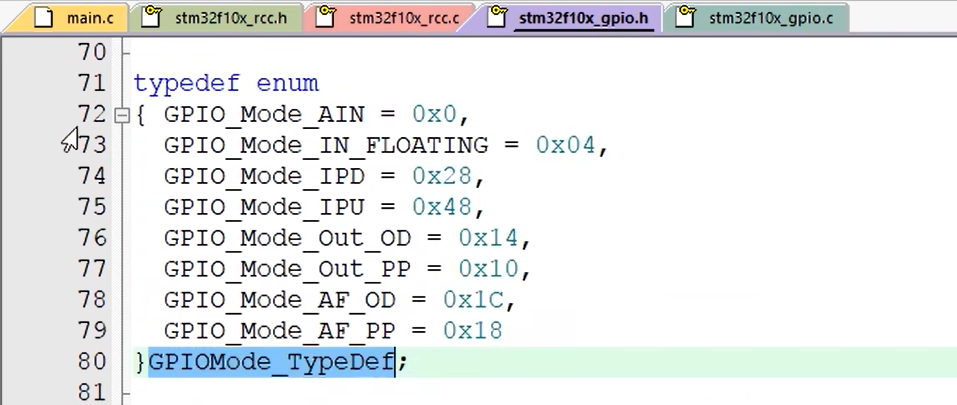 AIN(Analog IN)是模拟输入;IN FLOATING是浮空输入;IPD(In Pull Down)是下拉输入;IPU(In Pull Up)是上拉输入;Out_OD(Out Open Drain)是开漏输出;Out PP(Out Push Pull)是推挽输出;AF_OD是复用开漏输出;AF_PP是复用推挽输出。