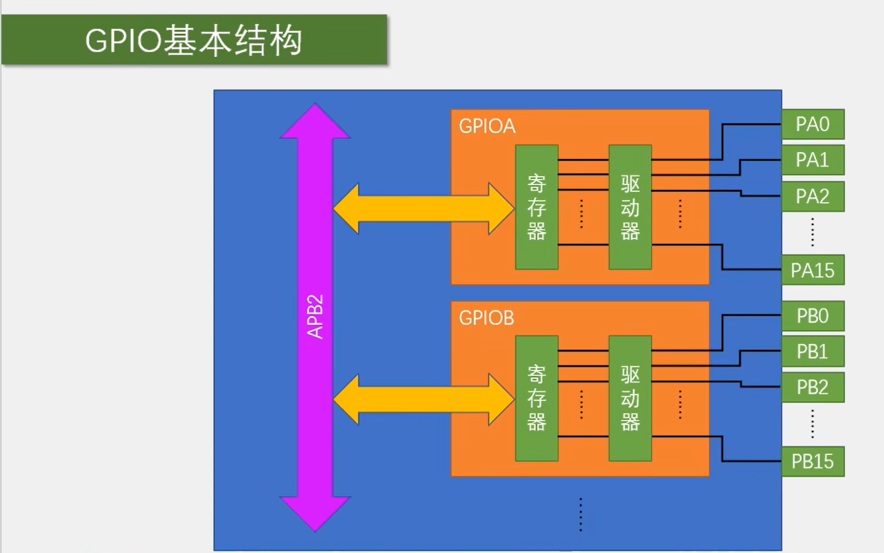 在每个GPIO模块内,主要包含了寄存器和驱动器这些东西。