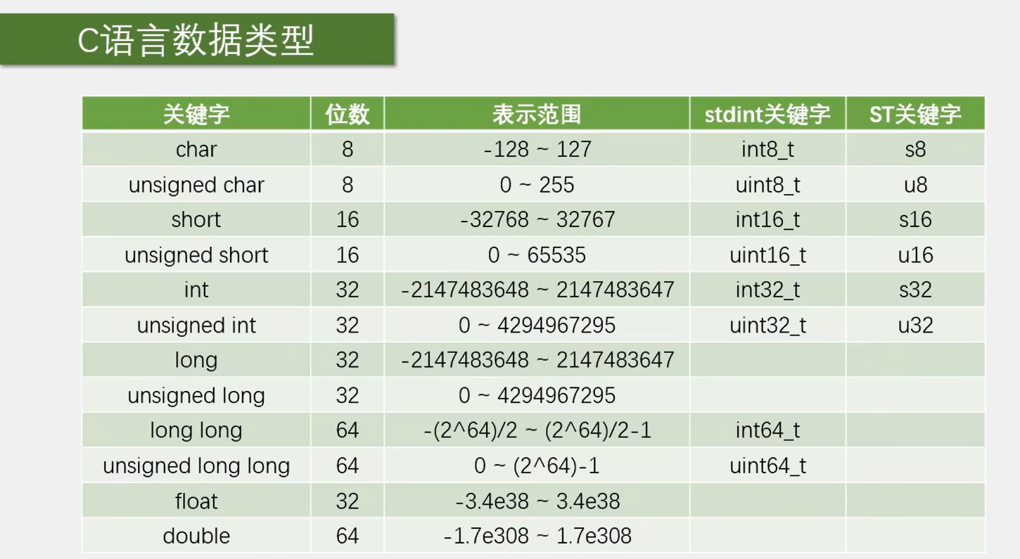 右边是C语言stdint.h文件和ST对这些变量的重命名。右边加个t表示这是用typedef重新命名的变量类型。