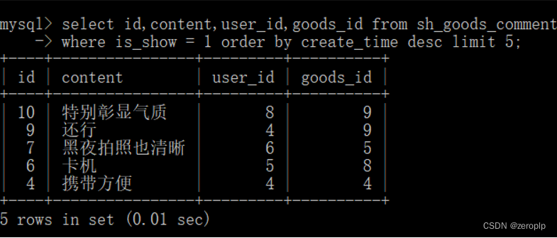 3、select id,content,user_id,goods_id from sh_goods_comment