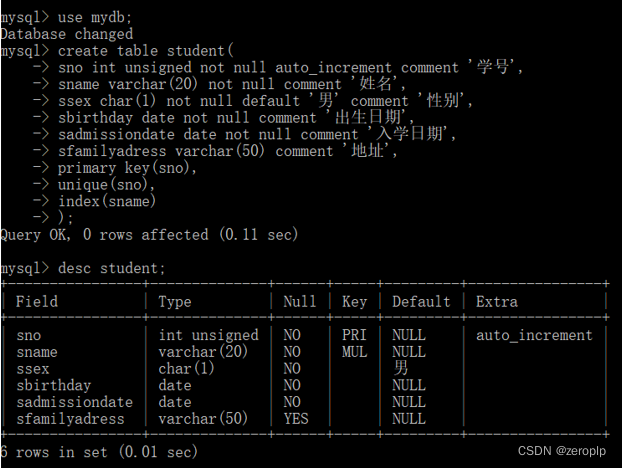 3.请设计一张学生表,选择合理的数据类型保存学号、姓名、性别、出生日期、入学日期、家庭住址信息。