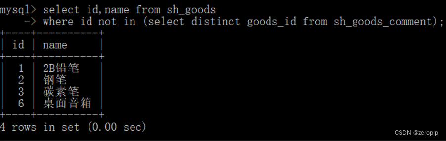 5、结合sh_goods和sh_goods_comment表,查询没有任何评论信息的商品id和name。