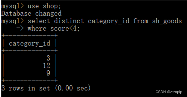 6.在sh_goods表中查询评分小于4的商品的不同分类id。