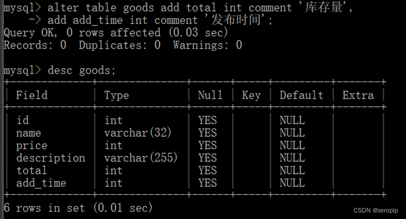 alter table goods add total int comment '库存量',