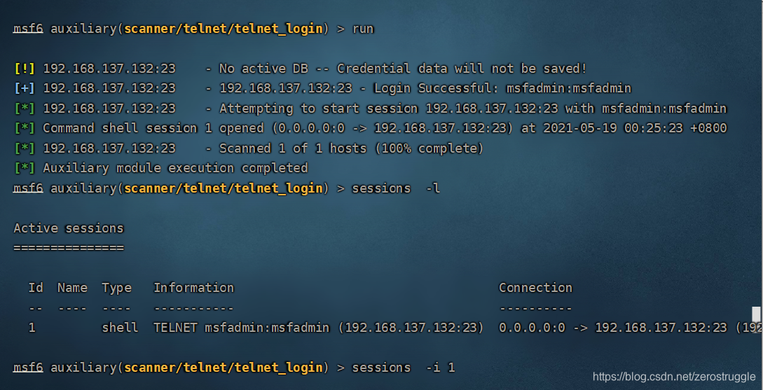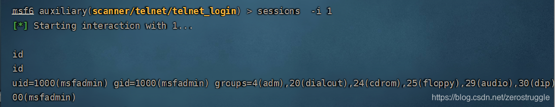 在metasploit中使用 telnet_login模块进行登录,并使用sessions -i id 连接shell。
