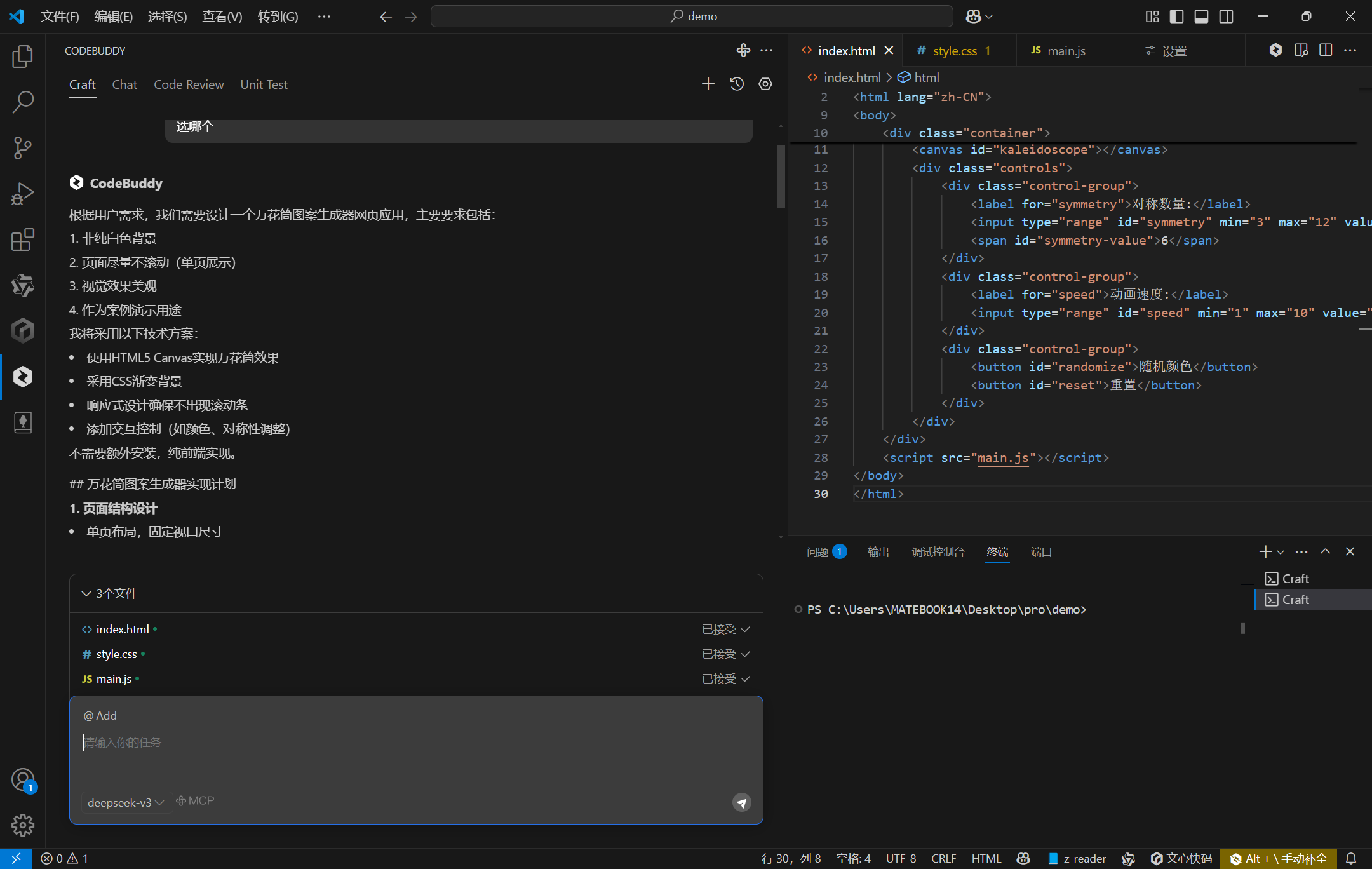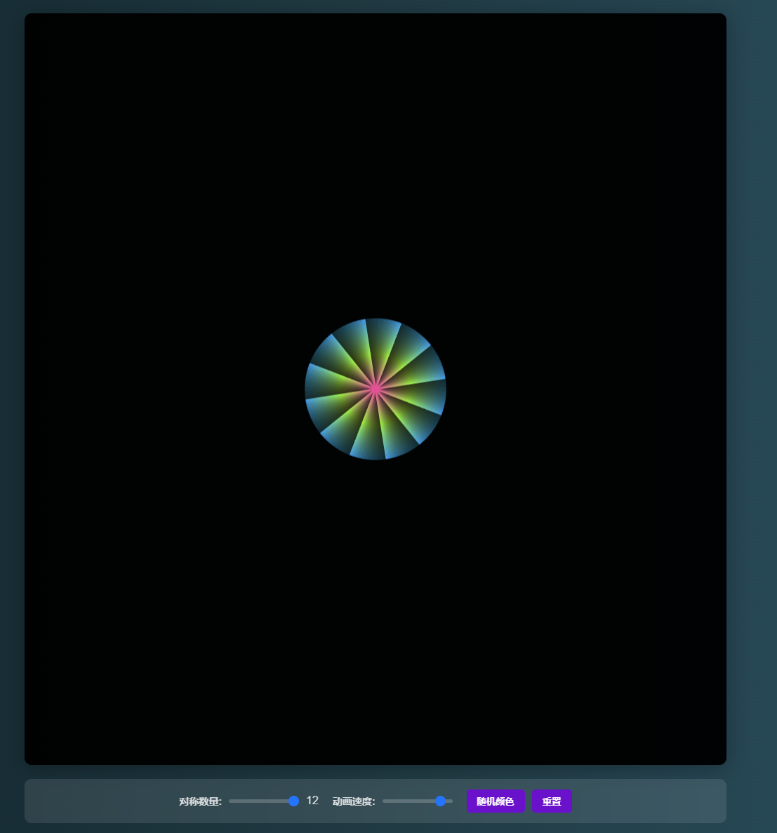 假设你想要一个互动式的万花筒图案生成器,用户可以通过滑块调整对称数量、动画速度,甚至随机化颜色。你可以简单地告诉CodeBuddy:“我需要一个交互式万花筒应用,支持鼠标和触摸操作,并且可以动态改变颜色和对称性。”短短几分钟内,CodeBuddy就能为你生成完整的前端代码,涵盖HTML结构、CSS样式以及JavaScript逻辑。
