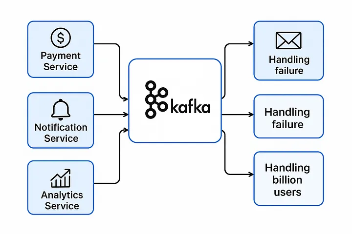 Now all the other services email, notification, fraud detection, analytics just listen to that message. When they see it, they act. But if they are down, or busy, or slowthe main flow doesn’t care. The user already got their payment done. The core transaction is complete.