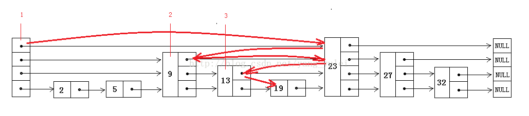 查找的过程从上至下,查找指针所经历的位置顺序如图中的1,2,3,直到找到目标数据19。