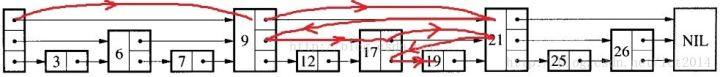 先看SkipList的查找过程,引用网上的经典图片,查找19。注意的是数据是有序的。