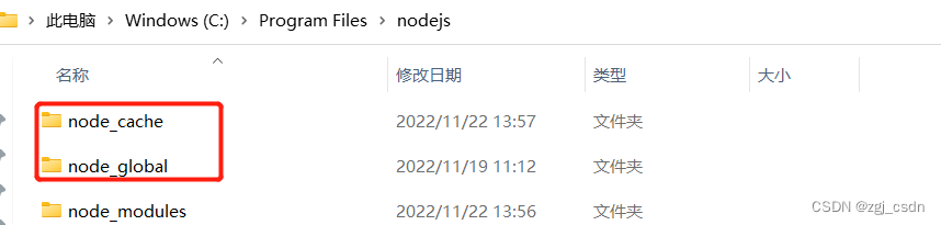 3.在node.js文件夹下新建两个文件夹node_global和node_cache作为默认安装目录和缓存日志目录。