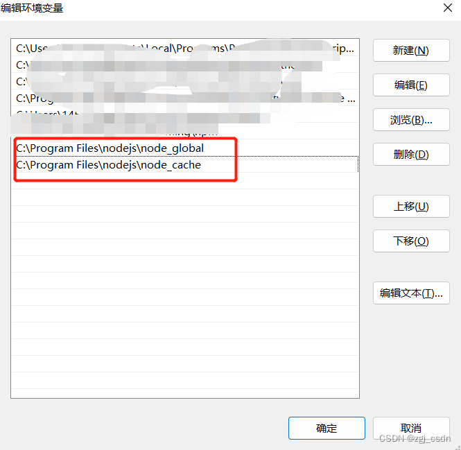 【用户变量】下的【Path】添加上【C:\Program Files\nodejs\node_cache】【C:\Program Files\nodejs\node_global】,这是nodejs默认的模块调用路径