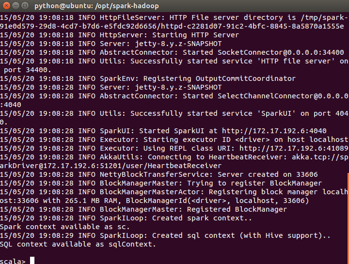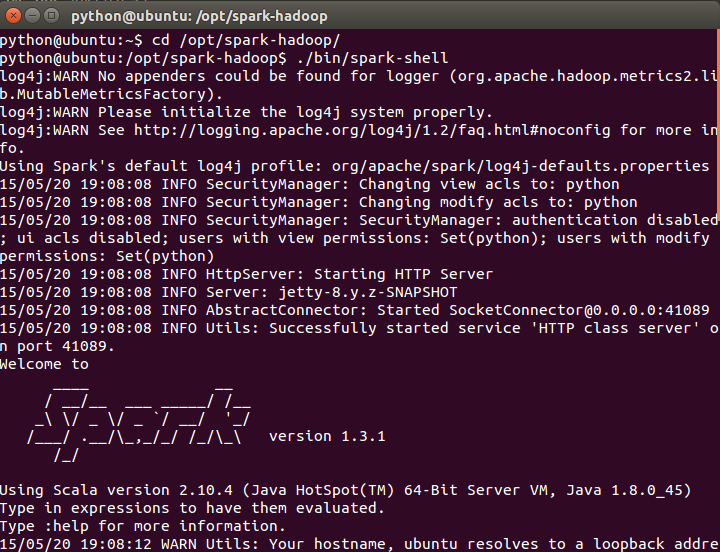 安装Spark,下载spark-1.3.1-bin-hadoop2.6.tgz,解压到/opt/spark-hadoop