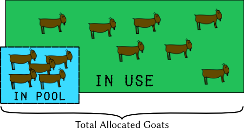 So far, the memory allocator has been called a number of times inalloc(), but each goat is still referenced at all times. If inuse, the canvas renderer holds a reference to that goat. If not in use,the object pool holds a reference to it. So the goat will never begarbage collected.