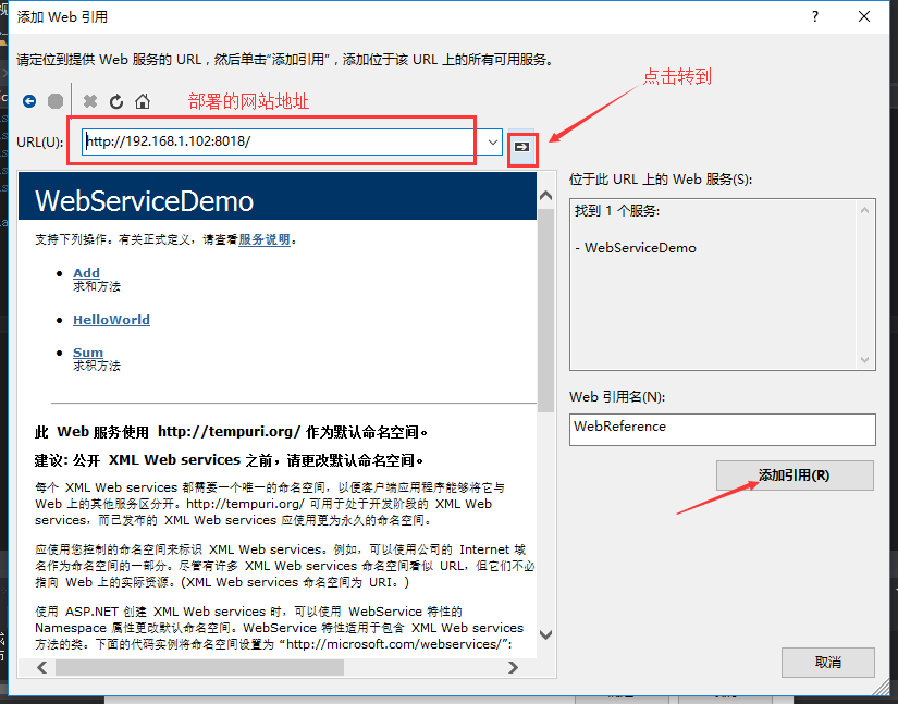 在URL栏输入部署的网站地址,然后点击转到,就可以看到下面的方法内容了,然后输入web引用名称,点击添加引用。