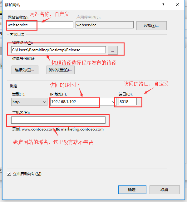 输入网站的名称、IP地址(本机可以不输入IP地址)和端口,选择文件的路径,然后点击确定,网站就创建完成了。