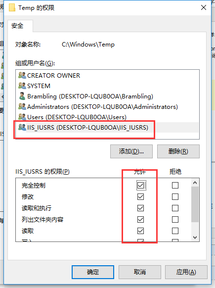 解决方法就是进入 C盘 windows 目录下的 Temp 目录,右键属性 > 安全栏 > 编辑 > IIS_IUSRS 的权限设置为完全控制。