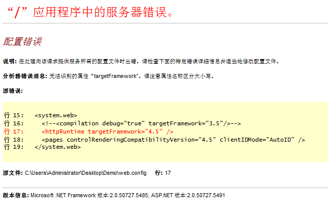 这个问题的是因为,应用程序池设置的原因,开始新建网站的时候没有选择应用程序池,默认为v2.0的版本,不支持 Framework 4.5。