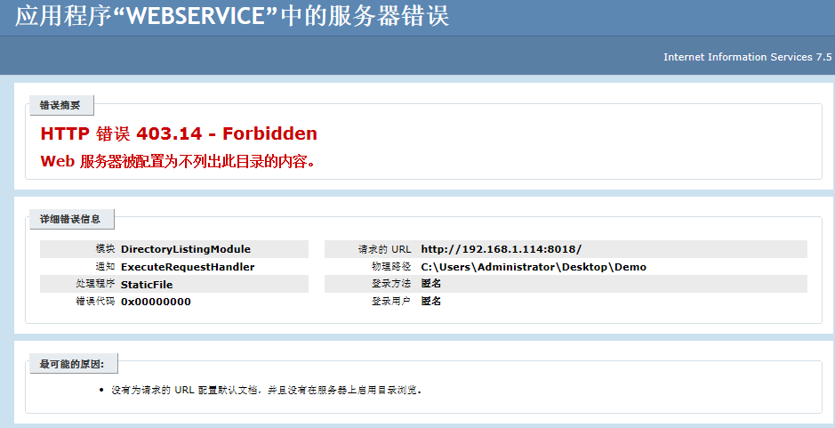 解决方法就是选中网站,点击默认文档,然后添加一个默认的页面,即应用程序的起始页面。