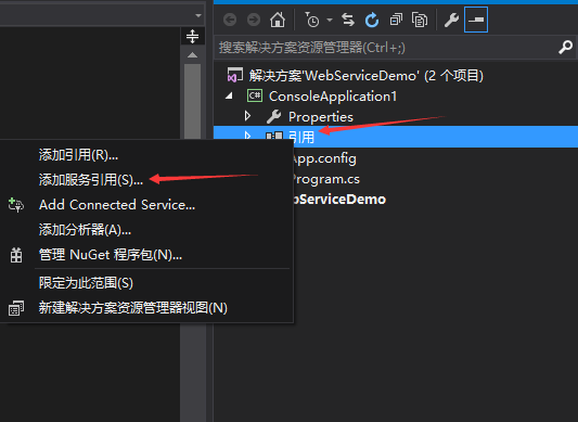 先添加一个控制台应用程序,然后右键引用,选择添加服务引用。