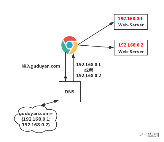 好,现在呢,多了一台web-server,你就可以通过在DNS里加一条配置,以DNS轮询方式进行负载均衡。如下图所示
