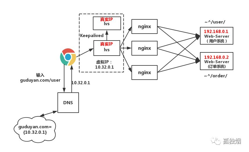 那这时候,光靠DNS就不行了,就需要采用DNS+nginx进行负载均衡!如下图所示