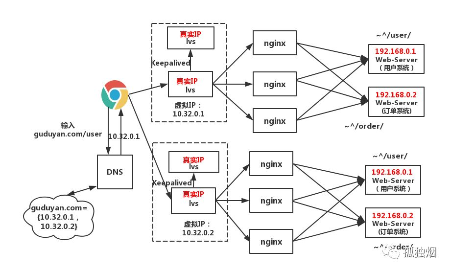 最后,为了应对亿级的PV,一般会在DNS端配多个Lvs集群的地址。如下所示