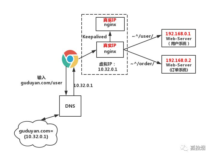 这里就要用keepalived了,用两台nginx组成一个集群,分别部署上keepalived,设置成相同的虚IP,这样一个节点在崩溃的情况下,另一个节点能够自动接替其工作,如下图所示