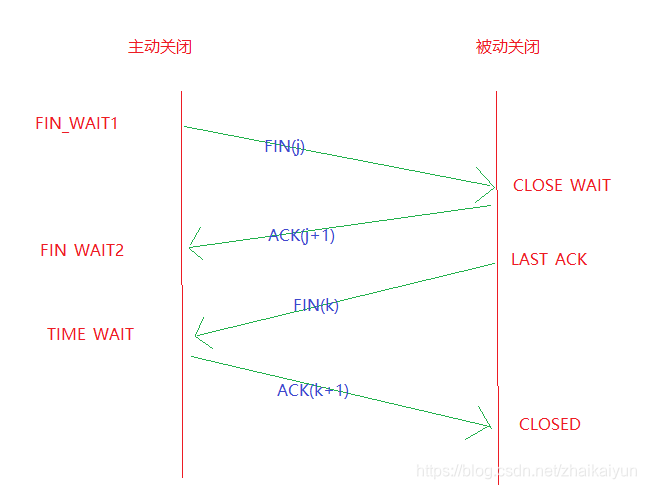 第四次挥手:主动关闭方收到被动关闭方发送的FIN并发送ACK,此时主动关闭方进入TIME_WAIT状态,经过2MSL时间后关闭连接,被动关闭方收到主动关闭方的ACK后,关闭连接。