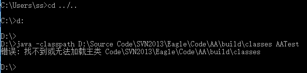 在命令行这里会将Code\SVN2013\Eagle\Code\AA\build\classes识别为要执行的类名。