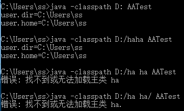 AATest.class文件放在放在D:/ha ha目录下。运行报错。